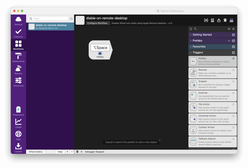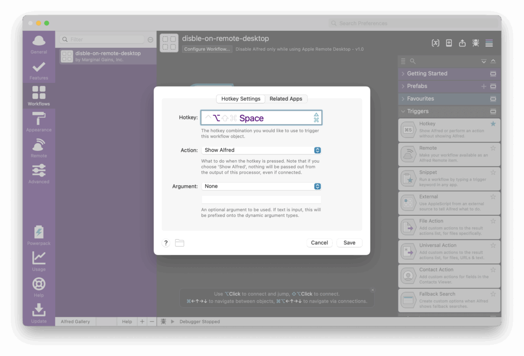 - リモート接続中(リモートデスクトップアプリのウィンドウが前面にあるとき):手元Alfredは無効化 → リモートMacのAlfredが起動